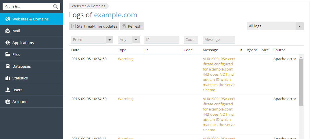 To access the Log Browser, go to Websites and Domains > Logs. You will be presented with a list of messages gathered from the logs. By default, the Log Browser displays messages present in the monitored logs at the moment of opening. If you want to refresh the list with messages added after opening the Log Browser, click Refresh. Alternatively, if you want to have new messages continuously added to the list, click Start real-time updates.