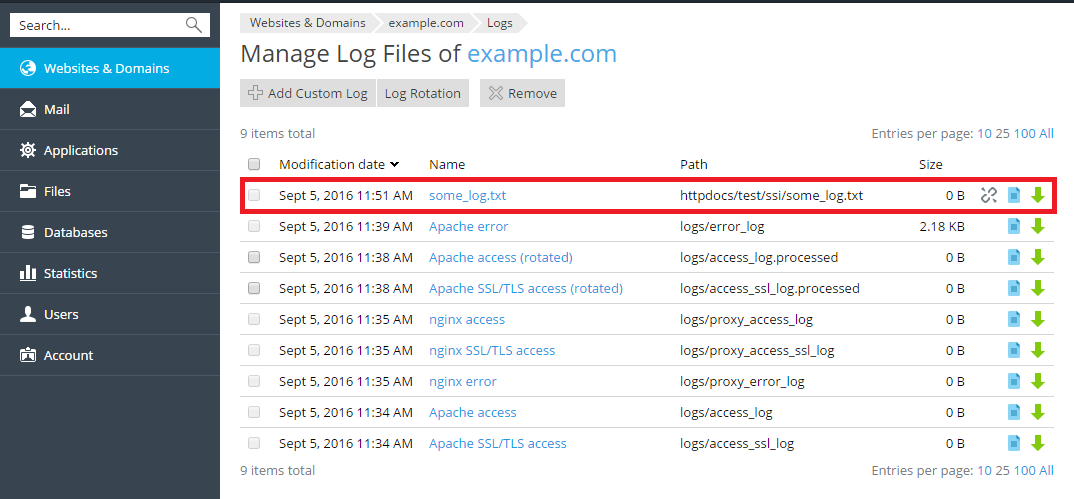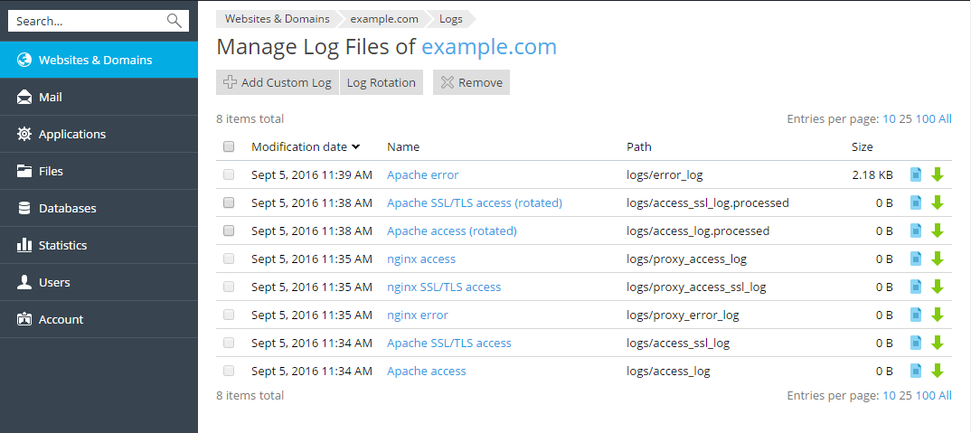 rotation, go to Websites and Domains > Logs > click the
