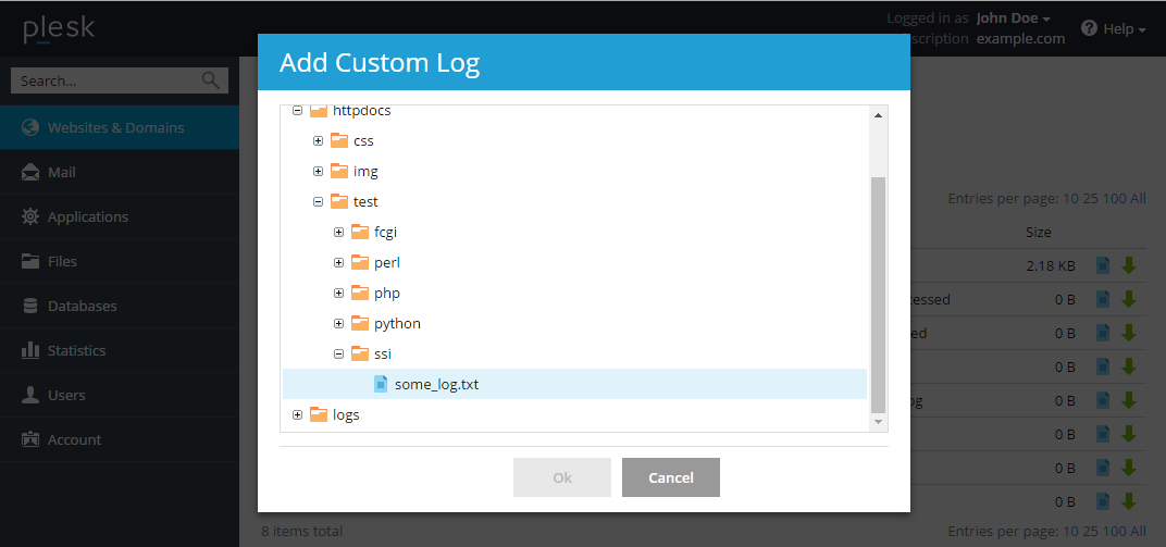 You can add any custom log file from you web site directory to track its changes in the Log Browser. To do this, click the Add Custom Log button on the Manage Log Files page. The tree with your web site folders will be displayed. Select the file that you want to add to the Log Browser and click OK.