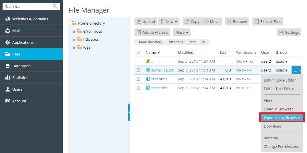 You can also open a text file in the Log Browser directly from the File Manager, using the Open in Log Browser option.