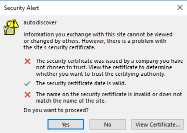*) in the DNS settings. To enable mail autodiscover via HTTPS for these domains, create a wildcard subdomain in Plesk, get a wildcard SSL/TLS certificate, and secure the following with this certificate: the domain itself, the mail server, and the created wildcard subdomain. To secure the wildcard subdomain, go to its Hosting Settings and choose the wildcard certificate (the one that has the asterisk prefix*). Choosing the wildcard certificate for the wildcard subdomain is necessary because it will otherwise use the self-signed Plesk SSL/TLS certificate by default (even if a wildcard certificate was issued). If you do not choose the wildcard certificate for the wildcard subdomain, you will see a warning message during mail autodiscover. In Microsoft Office Outlook, the message looks like this: