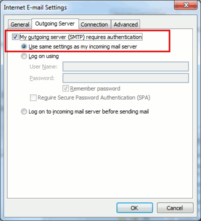 Click More Settings, open the “Outgoing Server” tab and select the “My outgoing server (SMTP) requires authentication” checkbox.