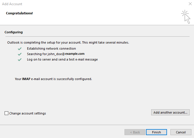 - To see the configured settings, select the “Change account settings” checkbox and then click Finish.