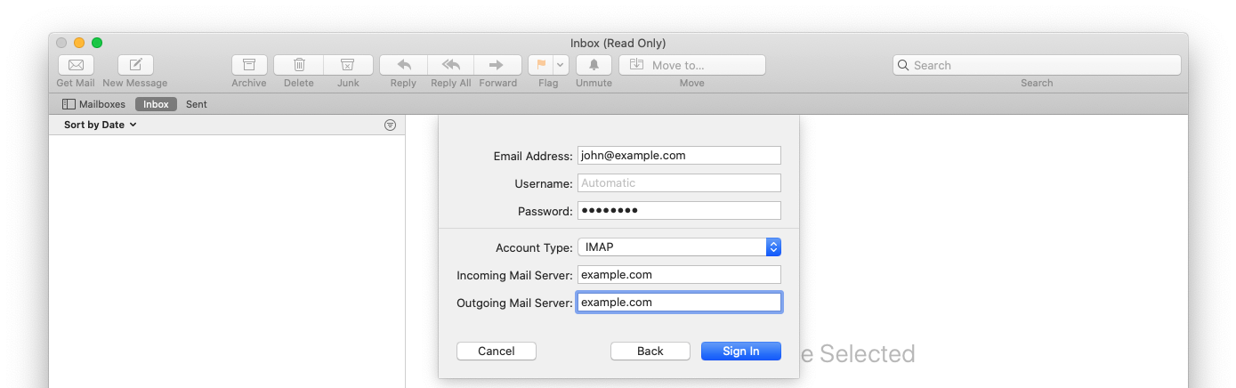 Specify the domain names of the incoming and outgoing mail servers and then click Sign In.