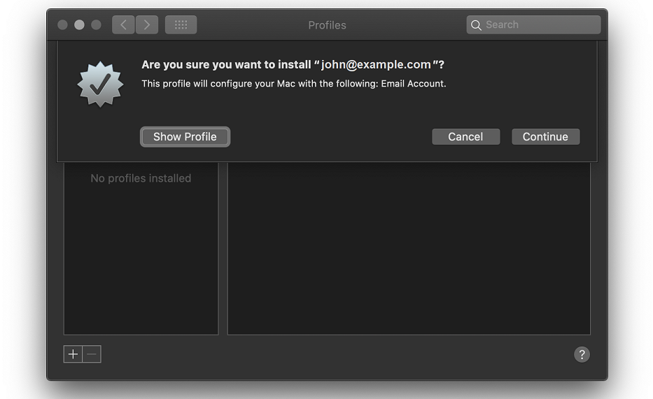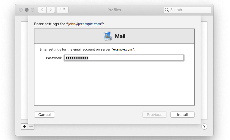 Enter your mail account password and then click Install to install your mail account profile.