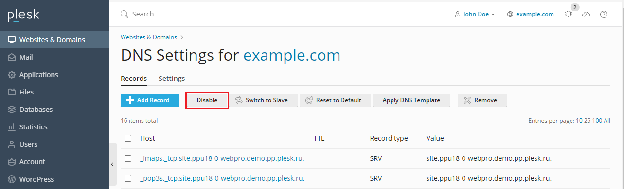 By default, domains created in Plesk use the Plesk DNS server for name resolution. However, in some situations this is not desirable. For example, if you are using a third-party DNS server or servers that are authoritative for your domain, it is recommended to disable the Plesk DNS service for the domain. To do so, go to Websites & Domains > DNS Settings and click Disable. If, at a later time, you change your mind, click Enable to switch the Plesk DNS service for the domain back on.