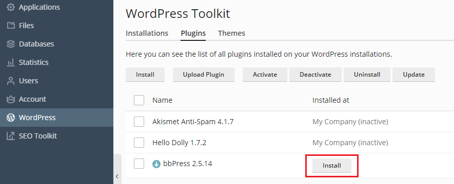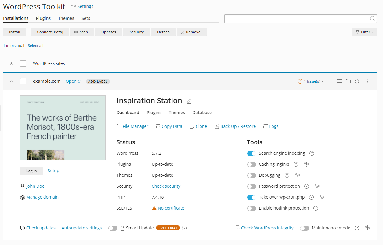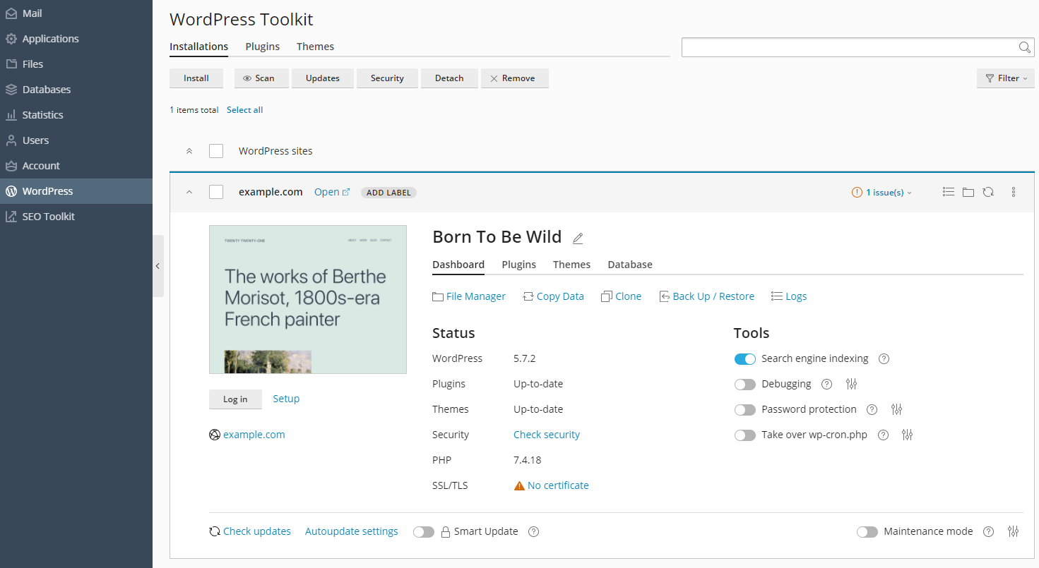 WP Toolkit is a single management interface that enables you to easily install, configure, and manage WordPress. It is available if the WP Toolkit extension is installed in Plesk.