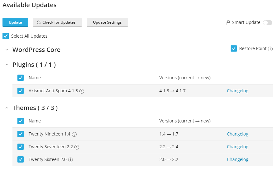 If an update of a WordPress core is available, you will see the “Restore Point” checkbox. Keep this checkbox selected to create a restore point you can use to roll back the update if something goes wrong.