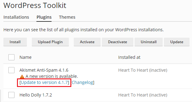 Although WP Toolkit regularly checks for updates itself, you can also check for updates at any time. To do so, click “Check updates”.