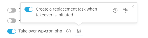 - Keep your task and delete the task created by WP Toolkit. To do so, turn off “Create a replacement task when takeover is initiated”.