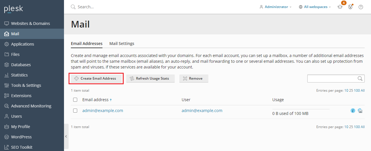 webmail.example.com, whereexample.comis the Internet address of your website. When prompted, specify your full email address as the username (for example,mail@example.com), and specify the email address password. - When logged in to Plesk, go to Mail, and in the list of email