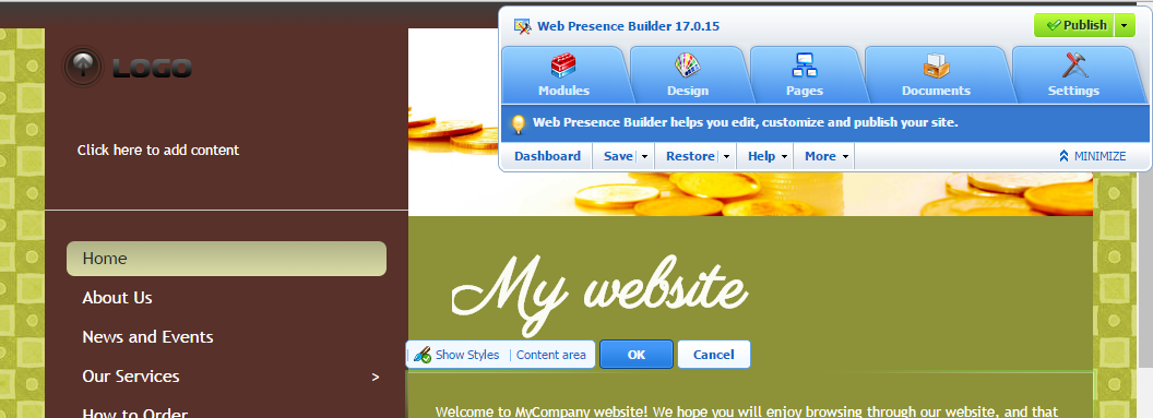 In Presence Builder, you can change almost any element of your website. Most of the elements are changed in place - you open a page where the element is used, edit it and see the result right away. Site-wide elements, such as those inserted in DESIGN areas are changed in one place but the changes are applied to each page of your website.