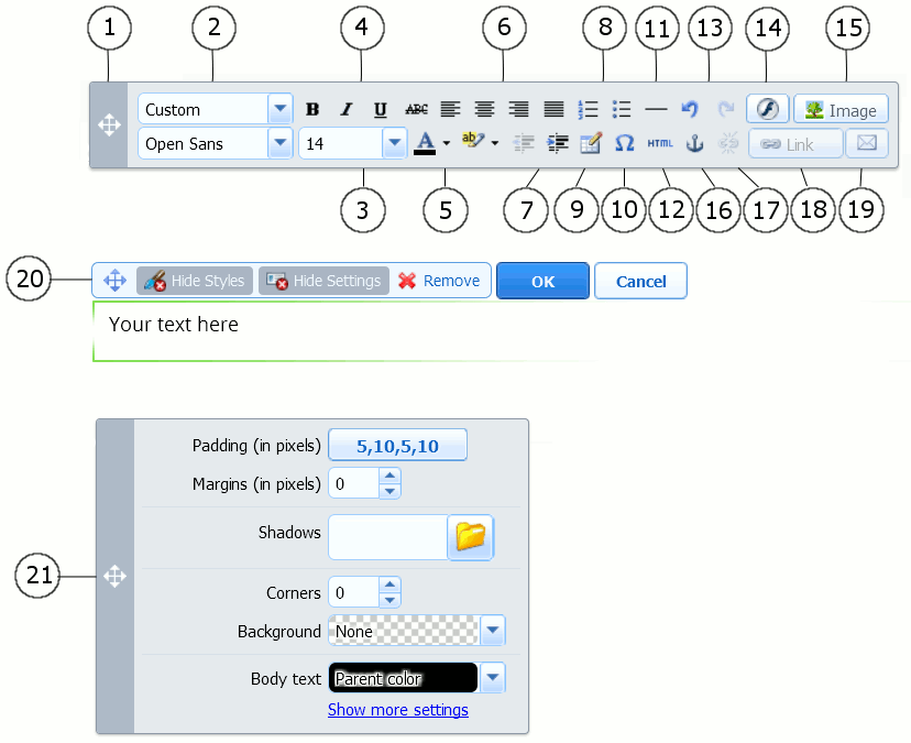 The toolbar and panels of the Text & Images module provide access to the following tools and functions.