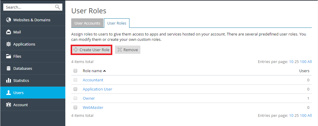User roles are used to define what Plesk functionality is available to additional users. Every additional user must have a user role assigned to them, and every role includes a set of permissions that determine what operations users who are assigned that role can perform in Plesk.