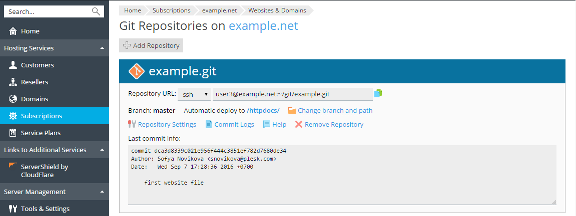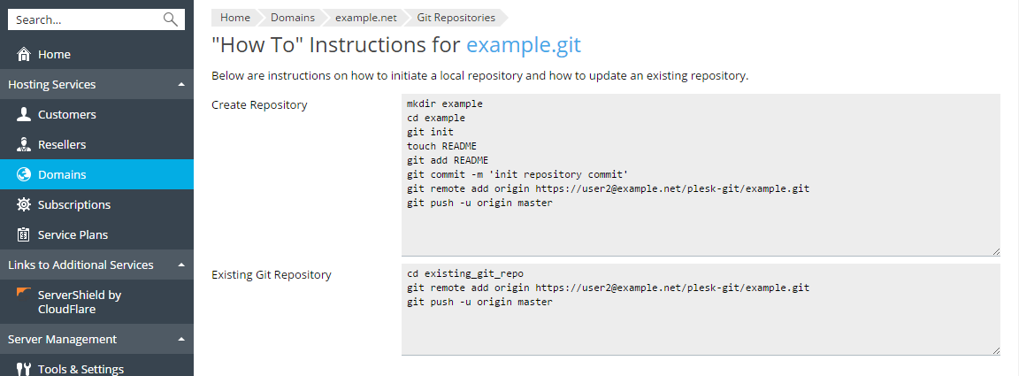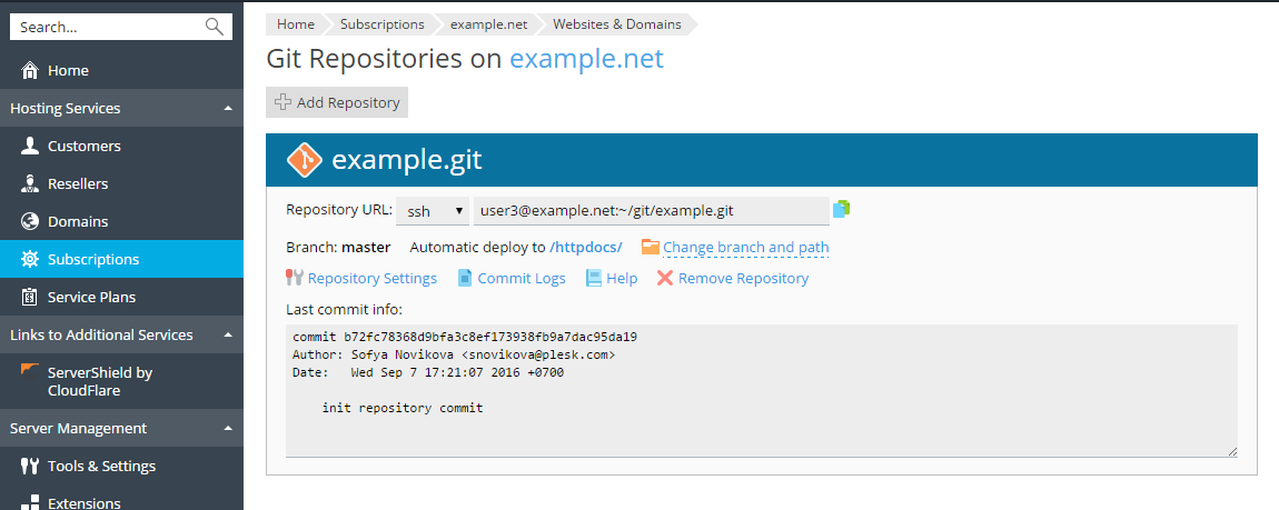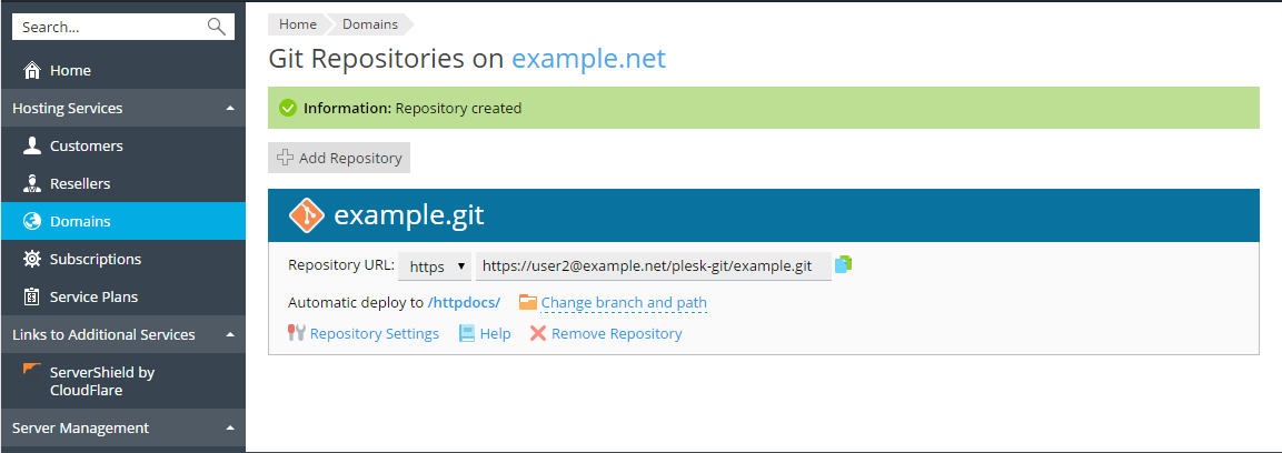 Git Repository in Plesk. Specify the repository name. By default, the name of the domain is used with the .git suffix.
